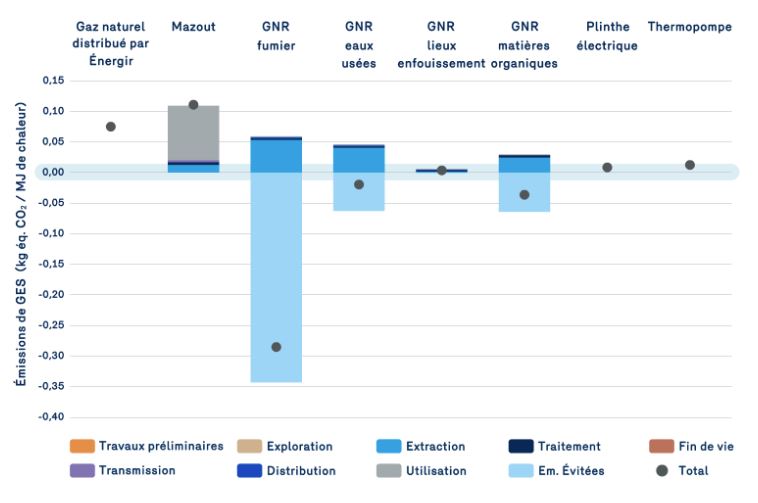 Tout comme l’hydroélectricité produite au Québec, et bien que le GNR soit une énergie de source renouvelable, sa production et sa distribution produisent des émissions de GES.